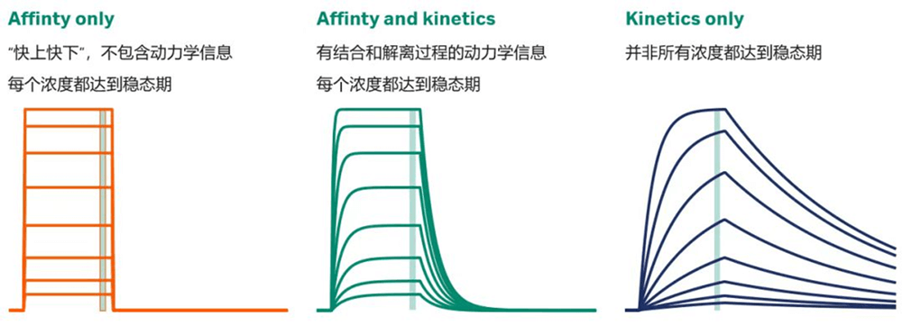 关于拟合模式的选择,是选择动力学法(Kinetics)分析还是稳态法(Affinity)分析,主要是根据响应值图谱的形状来判断,如下图所示: