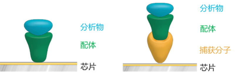 - 固定到芯片表面的生物分子称为配体,以溶液形式流过配体的另一个相互作用分子为分析物,在药物发现和开发工作中,配体有时候被称为靶点分子。共价偶联为配体通过化学偶联试剂共价地固定于芯片表面 。也可以通过捕获的方法,在芯片表面固定一个会与配体高亲和力结合的捕获分子。根据样品与实验特性选择适合的方式