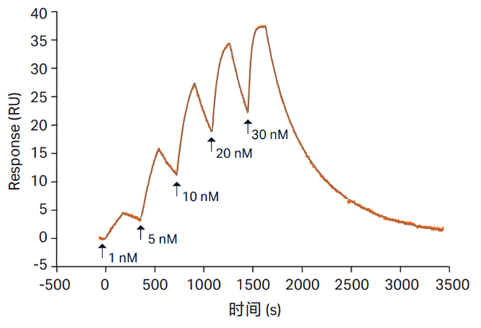 - 多循环动力学(如下图):进样一系列浓度的分析物,每个循环只分析一个 浓度的样品,在每次进样后对芯片表面进行再生。在多循环动力学中对再生条件进行优化十分重要。