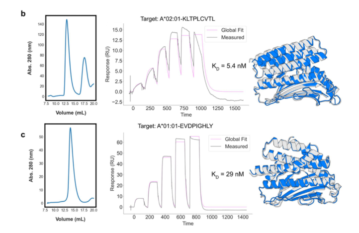针对10个不同的pMHC复合物(涵盖病毒抗原、肿瘤相关抗原、neoantigen),设计并筛选出高特异性结合蛋白。全基因合成后克隆到pET29b(+) 载体中,大肠杆菌表达后,使用Ni柱和凝胶过滤(Superdex 75 10/300GL)两步纯化。