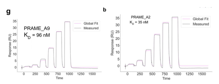 结合动力学分析在Biacore8K通过Biotin CAPture Kit捕获法完成。捕获生物素化的肽-MHC单体约250 RU,蛋白binder(分析物)在HBS-EP+缓冲液中,以30 µL/min 流速进样,浓度范围为1 nM 至1 µM。