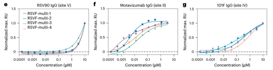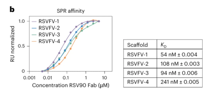 结果显示,单表位设计(RSVFV-1 至 RSVFV-4):KD 范围:54–241 nM(比天然 RSVF 三聚体的0.9 nM 差约50倍,但比之前报道的设计0.9 μM提高约20倍)。