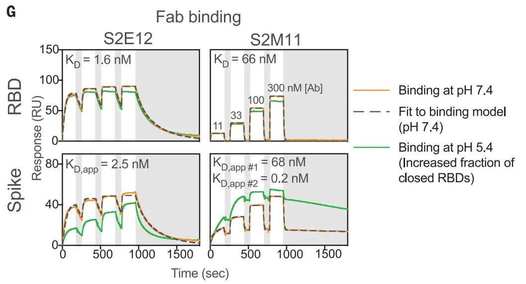 - 华盛顿大学 David Veesler 研究团队在《Science》上发表文章《Ultrapotent human antibodies protect against SARS-CoV-2 challenge via multiple mechanisms》,借助 Biacore T200 完成了中和抗体 S2E12、S2M11 与 RBD 的亲和力及动力学参数检测。