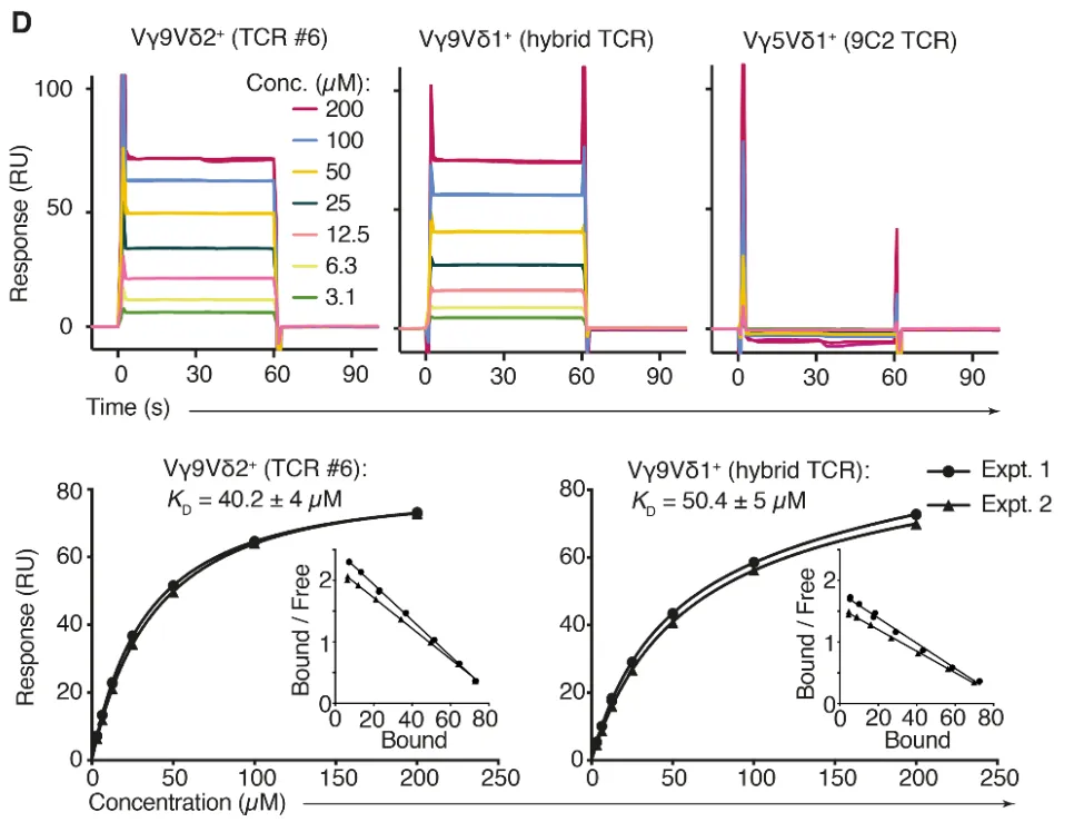 - 澳大利亚墨尔本大学和奥利维亚牛顿-约翰癌症研究所等研究团队在《Science》上发表文章《Butyrophilin 2A1 is essential for phosphoantigen reactivity by γδ T cells》,揭示了 γδ T 细胞检测癌症和感染新机制。在该研究方案中,研究人员借助 Biacore T200 完成了 BTN2A1 与 Vγ9+Vδ2+、Vγ9+Vδ1+与 Vγ5+Vδ1+ γδTCRs 的多组亲和力检测。