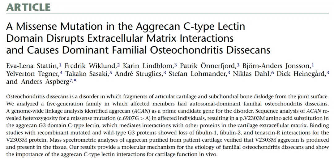 剥脱性骨软骨炎是软骨和软骨下骨与周围组织分离,主要影响膝关节、踝关节和肘关节,涉及骨骼发育紊乱,不成比例的生长和骨骼变形(图3)。研究人员对一个五代遗传性剥脱性骨软骨炎家族进行了全基因组连锁分析后,发现Aggrecan蛋白G3结构域发生了一个错义突变p.V2303M。将相关G3结构域变体与多种细胞外基质蛋白重组表达后,使用Biacore进行相互作用分析。