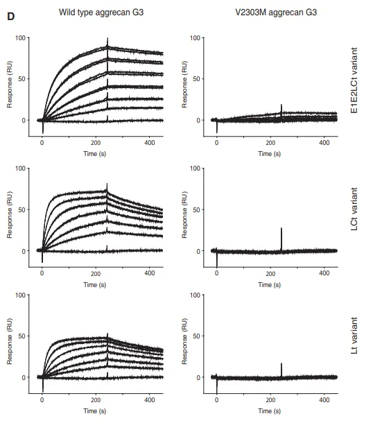首先,研究人员使用Biacore将细胞外基质纤维蛋白fibulin-2固定在CM5传感芯片上,三种Aggrecan蛋白的野生型与V2303M G3结构域突变体Lt/LCt/E1E2LCt Variant分别作为分析物流经芯片表面,检测不同Aggrecan野生型、突变体和胞外基质蛋白的结合情况。结果如图4所示,所有野生型G3结构域均表现出与fibulin-2非常强的相互作用,而所有V2303M突变体的相互作用则明显减弱甚至丧失。