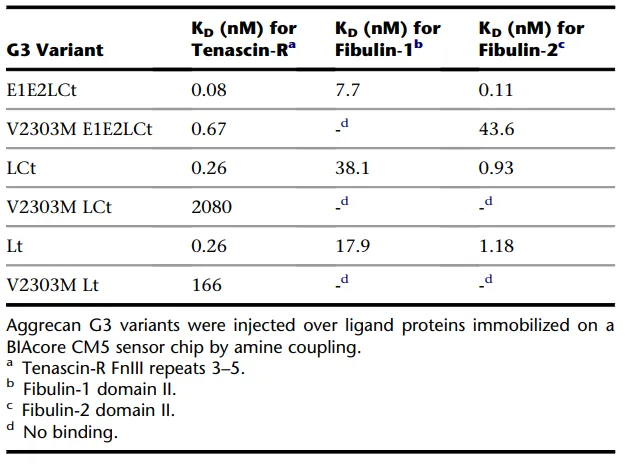 随后,研究人员又研究了其他胞外基质蛋白与Aggrecan蛋白及其突变体的互作情况。他们将胞外基质蛋白tenascin-R、fibulin-1和fibulin-2固定在CM5传感芯片的不同通道,将三种野生型以及三种V2303M G3结构域突变体Lt/LCt/E1E2LCt Variant流经芯片表面,检测互相的亲和力/动力学。结果如表1所示,所有V2303M G3突变体与细胞外基质蛋白tenascin-R、fibulin-1和fibulin-2的结合均受到影响,均显示亲和力减弱或完全丧失。这清楚地表明家族性剥脱性骨软骨炎相关的V2303M突变影响正常的Aggrecan G3结构域功能。