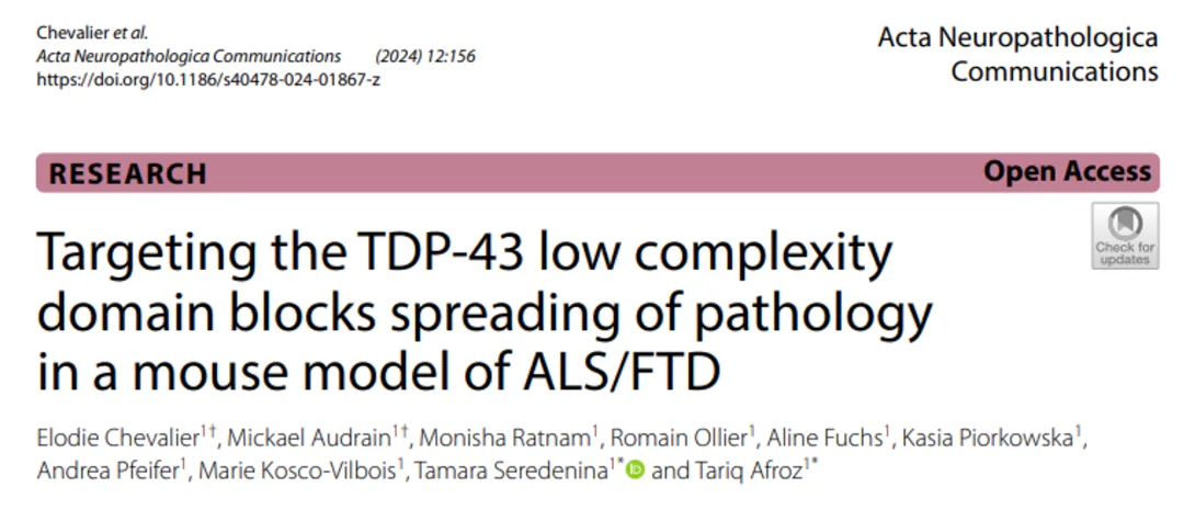 瑞士生物制药公司AC Immune SA在《Acta Neuropathologica Communications》中发表文章,该研究首次证实:靶向TDP-43蛋白酶抗性淀粉样核心的免疫疗法,可通过阻断病理传播显著延缓或终止疾病进展。