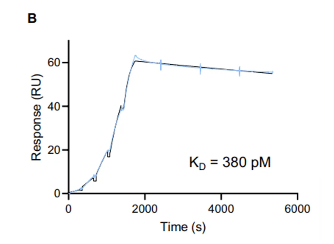 作者用Biacore 8K,将TDP-43固定在CM5芯片表面,1.2-100 nM的ACI-6677作为分析物流过芯片表面,实验表明两个分子之间的亲和力高达380 pM。