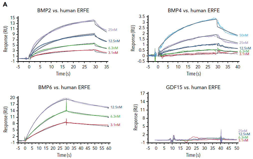 为验证ERFE对于BMP/SMAD信号通路的抑制,研究者将人ERFE通过氨基偶联固定在CM4芯片(BR100534)上,将重组蛋白BMP2,BMP4,BMP6,GDF15(阴性对照)对半稀释后进行浓度梯度进样(3.13 – 50 nM),使用10mM Glycine pH1.5进行再生。研究表明ERFE以纳摩尔级的亲和力结合BMP6,以较弱的亲和力结合BMP2和BMP4。随后,研究者开发了针对ERFE的抗体,解除铁调素的抑制,修正β-地中海贫血小鼠模型的铁负荷表型。