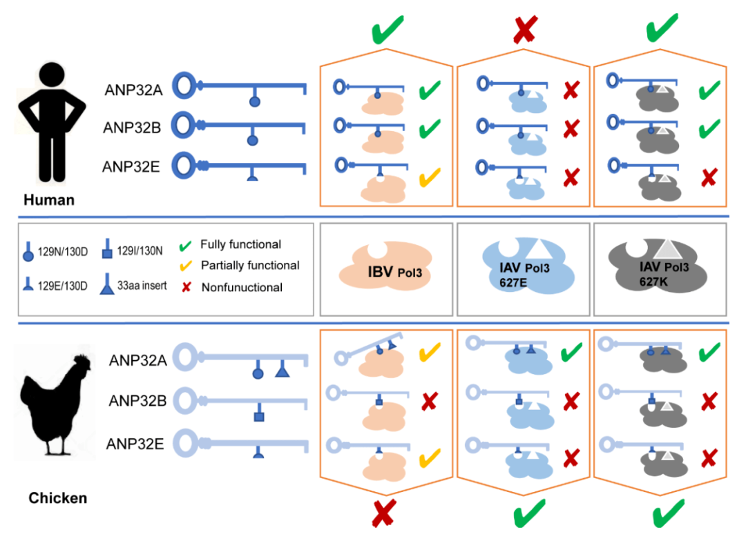 图 5 IAV 和 IBV 聚合酶对 ANP32 蛋白的选择性使用及其分子基础