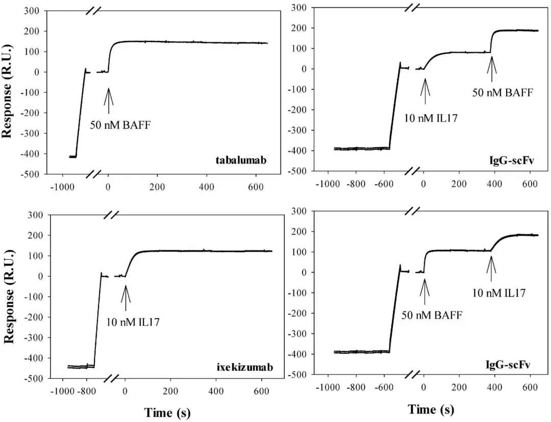 研究团队从特异性识别IL-17A的亲本抗体ixekizumab(Taltz®)中提取scFv(single-chain variable fragment),并通过富含甘氨酸的linker将scFv与特异性识别BAFF的亲本抗体tabalumab进行偶联后,经过多轮优化和质控,得到四价双特异性抗体LY3090106。