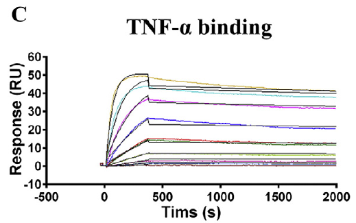 信达生物制药(苏州)有限公司、四川大学华西医院、南开大学医学院等单位,联合筛选到一株针对TNF-α(肿瘤坏死因子-α)的单抗IBI303,可通过抑制炎症发生、血管生成的双机制逆转银屑病的发病进程。2015年,上述单位在《International Immunopharmacology》发表文章《Anti-TNF-α monoclonal antibody reverses psoriasis through dual inhibition of inflammation and angiogenesis》。实验证明,单抗IBI303在体外能有效减少炎症细胞浸润和促炎细胞因子释放,并能显著抑制小鼠内皮细胞的血管生成。在此文章中,研究团队使用Biacore T200完成相关结合性表征实验,证实IBI303能够有效识别并结合于TNF-α,从而发挥功效(图1)。两者亲和力达到5.284 × 10-11 M,Biacore宽广的亲和力检测范围和出色的基线稳定性保证了这类高亲和抗体的准确检测。