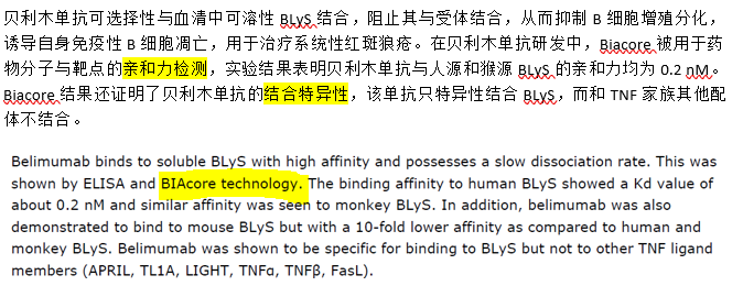 2011年3月9日,葛兰素史克公司(GSK)研制的贝利木单抗(Benlytsa)获得美国和欧盟批准,用于自身抗体阳性的系统性红斑狼疮成年患者的治疗。这也是近50多年来获批用于治疗红斑狼疮的首个新药,Benlytsa的上市具有划时代的意义。查阅相关已公开资料,我们可以看到研发团队借助Biacore设备完成了Benlytsa与对应靶蛋白BLyS的动力学亲和力表征数据,具体数据见图2。