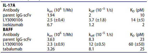 该团队使用Biacore对抗体LY3090106、亲本抗体与对应靶点的亲和力、动力学特征进行了表征,结果见表1。
