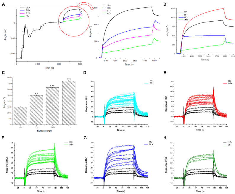 研究团队采用IHC、ELISA、SPR等检测技术,对PGLI-M3区分麻风感染状态的特异性及准确度进行了逐一验证。结果表明,SPR检测技术平台可达到100%的精确度(accuracy),具体结果见图4。该实验方案中,PGLI-M3作为固定相锚定在传感芯片表面,然后将麻风确诊者(lepromatous, LL)、边缘性患者(borderline-borderline, BB)、结核患者(tuberculoid, TT)、家庭接触者(contacts, HC-)、新生儿(newborn control, CNB)等人群的血清样本进行1:100稀释后上样,通过观察响应值变化来区分麻风病的感染情况。观察图4中的D-H图可知,相较HC-阴性组,其他组别都有特异性的、高信号值的响应特征。此研究内容也是首次在临床应用开发中使用嵌合肽的形式替代PGL-I来进行麻风受试者临床样本的筛查。