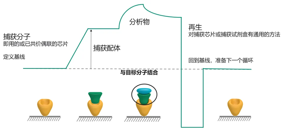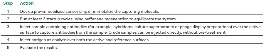 值得注意的是,使用Biacore,可以对抗体的特异性 (Specificity) 、结合动力学/亲和力 (Binding characteristics) 、表达水平 (Expression level) 进行“三合一”的表征筛选。其中较为常用的方式便是捕获法,采用商品化的或制备可抓取抗体的捕获芯片、先抓上清中的抗体然后再流过特定浓度的抗原,随后通过再生清洗掉芯片表面的抗体及抗原,从而达到重复使用的效果。