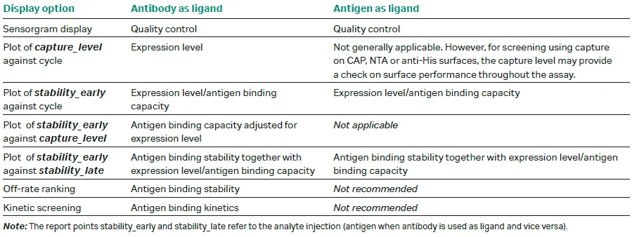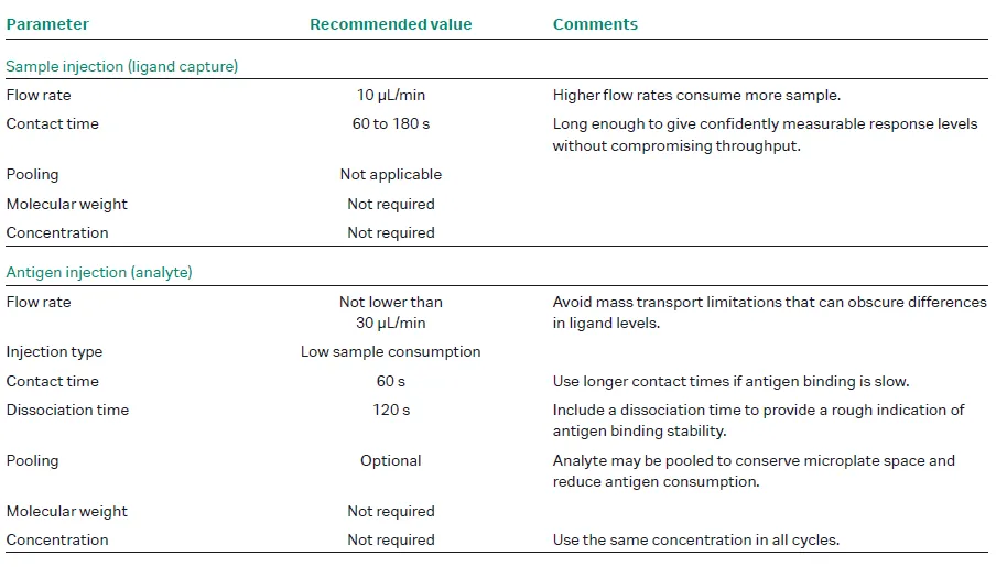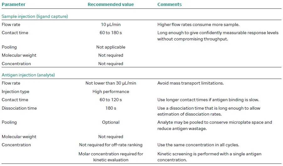 具体的实验条件及参数可依据实际需求进行选择,表2、3分别是从报告点或者是解离速率/动力学参数进行抗体上清筛选的参数细节,适用于Biacore所有机型。