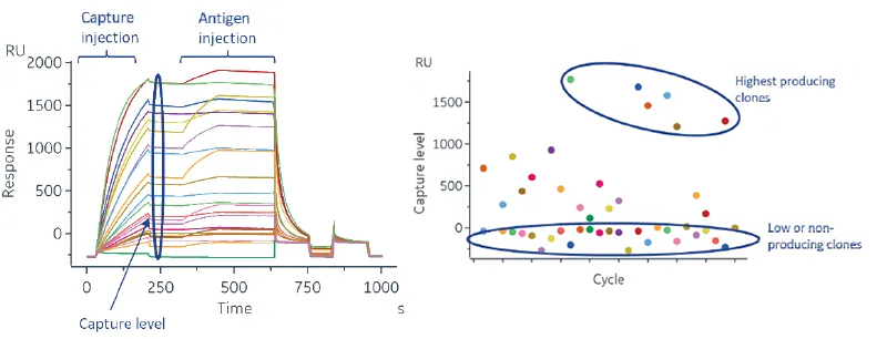 报告点筛选法:基于捕获抗体的Capture level数值,可以判断待筛选上清中的抗体表达量的水平;基于抗原上样后的Binding level数值,可以判断当前Cycle的捕获抗体是否能特异性识别抗原抗原结合活性