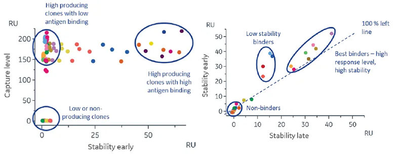 Stability_early/ Stability_late也是常用的筛选指标之一,也常用于抗原抗体结合水平高低的分析过程。例如图3,通过Stability early Vs. Capture level图、Stability late Vs. Stability early图,可以将待筛选的抗体上清进行有效分区,筛选出表达量高、抗原结合水平高的抗体上清。
