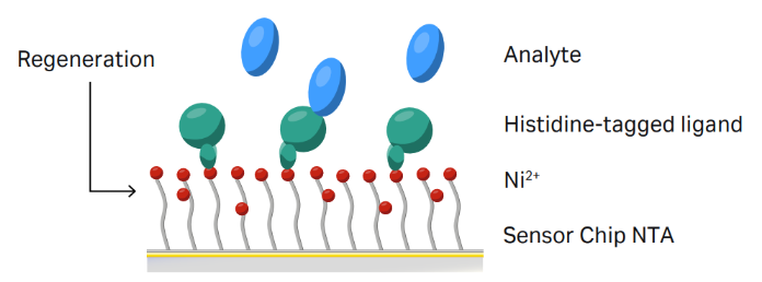 在金膜之上,NTA芯片的羧基化葡聚糖表面上修饰了NTA(次氮基三乙酸),NTA加Ni2+赋予其“捕获”功能,而未完全修饰的羧基基团则赋予其“偶联”的功能。使用“捕获”功能,可以得到特异性、可逆的捕获芯片,而同时使用“捕获”+“偶联”,就可以牢固地偶联His标签配体蛋白,且不需低pH缓冲液稀释。一张芯片,“双重”身份。