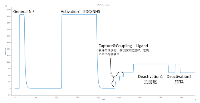 在Biacore控制软件中选择Immobilization-芯片类型选择NTA-add step-NTA Amine(Insight software of 1 series and 8 series, X100、T200及S200可在偶联方法中自定义偶联方法)即可开展实验。具体实验流程包括: