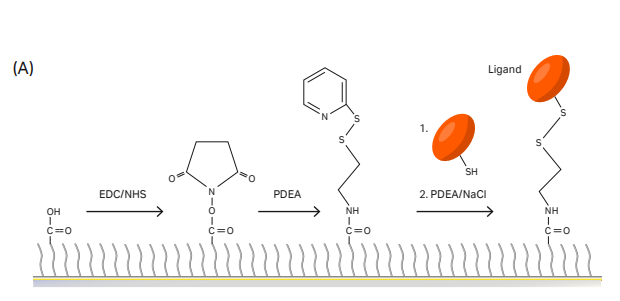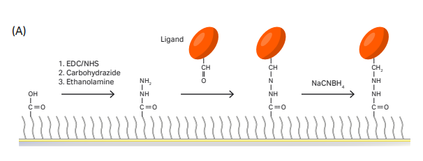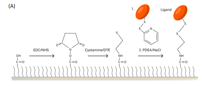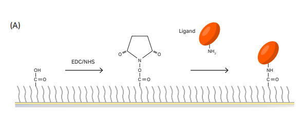 氨基偶联是将生物分子共价固定于传感芯片表面时使用最广泛的方法。CM3、CM4、CM5、CM7、C1、PEG芯片均可利用配体上的氨基来进行共价固定。氨基偶联原理如下图所示,传感芯片表面的羧基首先被EDC和NHS的混合物活化,从而生成具有反应活性的琥珀酰亚胺酯。然后,将配体分子流经传感芯片表面,琥珀酰亚胺酯与配体的伯胺基团或其他亲核基团发生反应,将配体共价连接于芯片上。