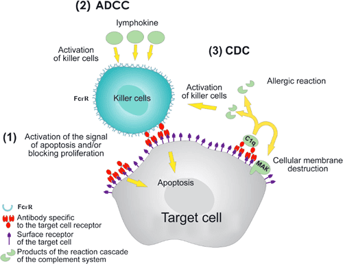 ADCC (Antibody-dependent cell-mediated cytotoxicity)抗体依赖细胞介导的细胞毒性作用:是一种细胞介导的免疫防御机制,指NK细胞的FcγR与IgG抗体Fc结合,诱导NK细胞并协助辨识而杀伤靶细胞。