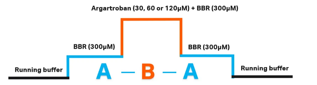 同时,研究人员利用Biacore特有的A-B-A进样设计竞争实验,证明Berberine与Argatroban结合在Thrombin相同的位点上。A-B-A的进样方式简化了竞争实验的设置,允许两种不同的溶液按照溶液A/溶液B/溶液A的顺序在同一个循环内进样,由于竞争样品无需再溶解在运行缓冲液里,大大减少了竞争样品的消耗量,非常适用于药物的竞争分析(图4)。