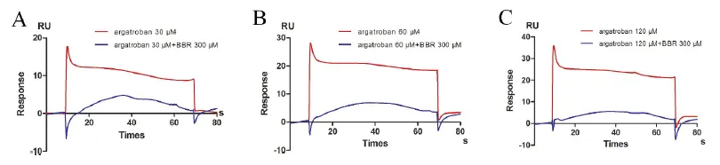 从图5的实验结果中可以看到:Berberine不存在时,Argatroban与Thrombin有明显的结合信号(图5,red line);而在300 μM Berberine存在的情况下(A-B-A样品设置参照图4),Argatroban与Thrombin的结合响应值明显降低(图5,blue line)。证明Berberine在Thrombin上的结合位点与Argatroban是一样的。综合后续的血小板凝集实验,这一研究说明Berberine是潜在的安全有效的凝血酶抑制药物。