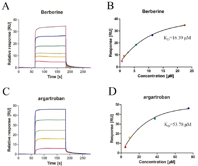 研究人员首先在Biacore上证明了Berberine可以直接与凝血酶结合,两者的亲和力为16.39 μM(图3 A/B),比已上市的抗凝血药阿加曲班 (Argatroban) 的亲和力更高(图3 C/D,KD=53.78 μM)。