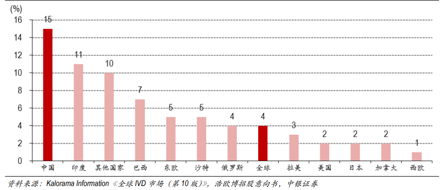 图1:2016~2021年全球各地区IVD市场预计复合年均增长率 (%)