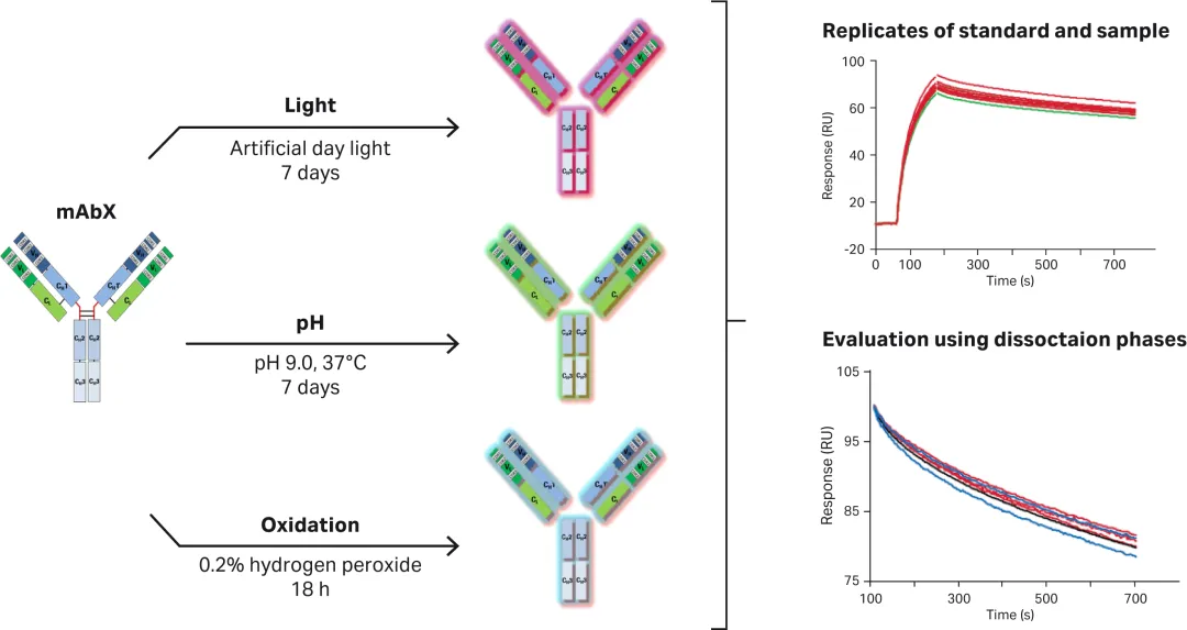 在特定的储存条件下,一定时间内抗体是否能保持其活性也很重要。常见对于原料稳定性的影响因素有温度及PH。目前大多数体外诊断生产公司倾向于使用37℃的加速破坏试验以模拟抗体的长期稳定性。其原理主要基于阿伦尼乌斯的经验公式推理而得,但是实际上加速稳定性并不能体现抗体的真实稳定性,试剂的使用场景决定了原料需要在不同的温度条件下表现依然稳定。Biacore不仅可以检测压力测试后的样品活性,其具有独立的控温系统,可在4-40℃的温控范围内进行亲和力检测,帮助更好地评估原料真实的性能。