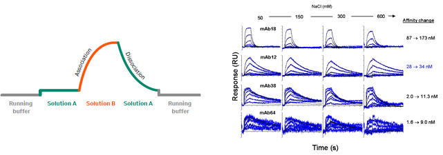 缓冲液“设置了环境”,在免疫诊断试剂中为结合提供合适的条件很重要。不仅要尝试不同的缓冲溶液,还要尝试这些溶液的不同浓度。即使是一个很小的浓度差异也能使检测成功或失败。在开发早期对不同缓冲液对抗体的亲和力影响进行评估,能够有效降低开发后期的风险。通过Biacore独有的A-B-A功能单次可以在保持连续流的基础上快速、便捷地检测高达4,608种不同缓冲液成分对抗体与抗原(待检测物)的影响,找到最合适的缓冲体系。