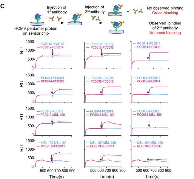 Biacore抗体竞争阻断分析实验中使用人抗体捕获试剂盒将Anti-human Fc固定在CM5芯片表面作为捕获分子,依次检测抗体与HCMV五聚体或三聚体的结合。结果表明,PC0012阻断了PC0014和PC0035与CMV五聚体的结合,而PC0014仅部分阻断,PC0035完全不阻断PC0012与CMV五聚体的结合。PC0014和PC0035没有阻断对方与CMV五聚体的结合(图2)。