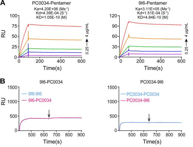 图3:Biacore测定PC0034以及对照组9I6结合五聚体的亲和力动力学及竞争阻断关系