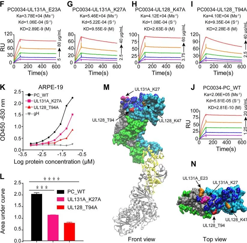 随后,研究者解析了五聚体的复合物晶体结构,结合突变实验用Biacore验证结合的关键性氨基酸。结果显示,PC0034与五聚体突变体UL131A_E23A、UL131A_K27A、UL128_K47A和UL128_T94A的结合显著降低。其中,突变体UL128_T94A和UL131A_K27A的亲和力分别降低约81倍和约34倍,对PC0034与五聚体的结合具有最强的影响,Biacore证明五聚体上UL128亚基的T94和UL131A亚基的K27是PC0034识别的关键表位相关残基。