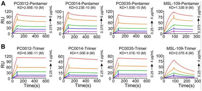 为了验证这些中和抗体与三聚体和五聚体的结合亲和力,研究者选择表面等离子体共振 (SPR) 技术对分离得到的抗体与已知中和抗体MSL-109的结合亲和力进行了比较。