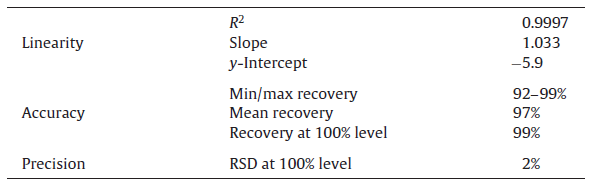 研究人员使用了60-140%活性浓度的标准品,测试了此实验方案的linearity、accuracy、precision等参数,具体数据如表1。
