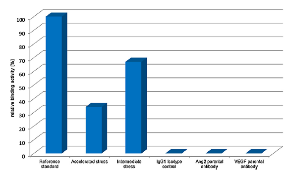 在文章中也提及了faricimab双抗是由VEGF、Ang-2特异性抗体组成的,所以研究人员也分别用单型亲本抗体进行了特异性测试,也设置了不同的处理条件(例如pH、温度),探究不同抗体的活性变化情况,结果见图4。看图可以发现单型亲本抗体或同型对照相较参考品,均没有信号响应,而经过处理后的抗体的活性则有不同程度的降低,即可充分证明此效价测定方案具有强特异性。