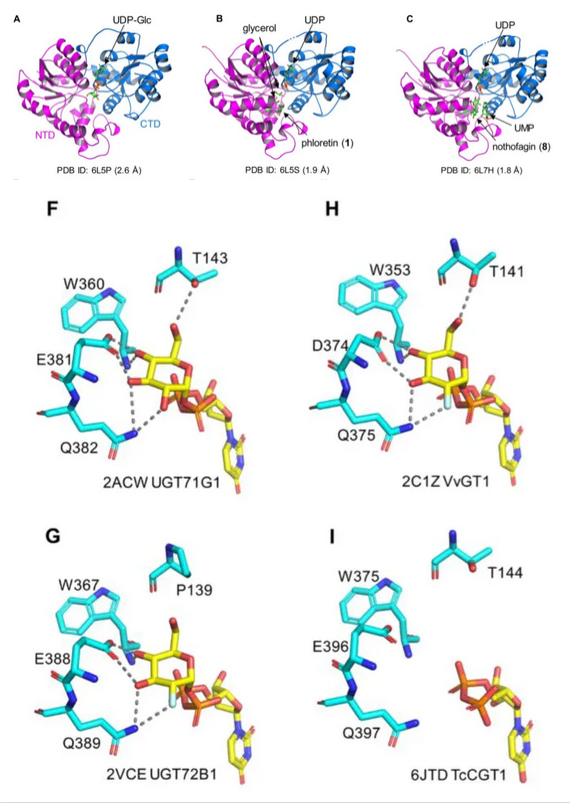 为了进一步研究 GgCGT 的催化机理,作者研究了 GgCGT/UDP-Glc、GgCGT/UDP-Gal、GgCGT/UDP/phloretin 和 GgCGT/UDP/nothofagin 的复合物晶体结构(如图 1,2 所示),GgCGT 成为了第一个具有晶体结构的双 C-糖基转移酶。