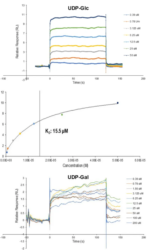 通过使用 Biacore 8K 生物分子相互作用分析系统,研究人员可以从分子层面入手,得到最直接的、无需标记的、定量的分子结合证据,证实 GgCGT 确实与 UDP Glc 有很强的结合,但与 UDP-Gal 却不结合(如图 3 所示),其中 GgCGT 与 UDP-Glc 结合亲和力(KD)为 15.5μM。 该结果也验证了此前作者通过其他方式对 GgCGT 糖供体选择性机制的推断。