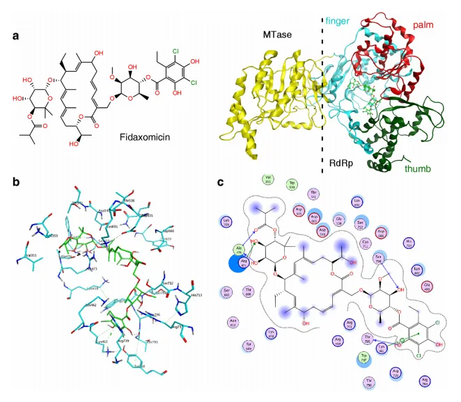 a. fidaxomicin 的化学结构式(左图),fidaxomicin 和 ZIKV RdRp 分子模拟示意图(右图,spiral ribbon mode);b. fidaxomicin 和 ZIKV RdRp 分子模拟示意图(stick mode);c. fidaxomicin 和 ZIKV RdRp 分子模拟示意图(two-dimentional mode)