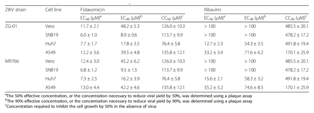 由表 1 中的 EC50、EC90与 CC50等检测结果即可看出,针对本实验方案中所用的 4 种细胞系与 2 株 ZIKV 菌株,fidaxomicin 相较 ribavirin 均具有非常明显的抑制病毒感染的效果,具有极大的临床应用前景。