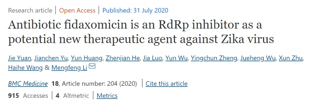 2020 年 7 月,南方医科大学黎孟枫教授团队在《BMC Medicine》杂志上发表了题为《Antibiotic fidaxomicin is an RdRp inhibitor as a potential new therapeutic agent against Zika virus》的文章。