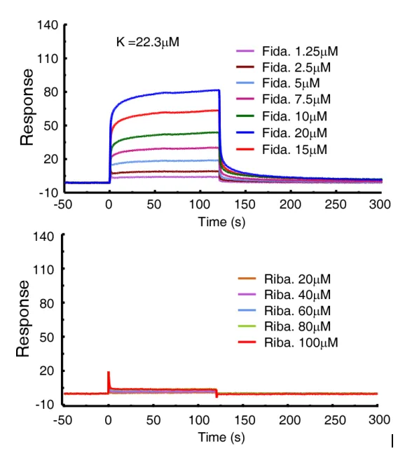 结果如图 3 所示,高潜分子 fidaxomicin 能精准识别蛋白 NS5 与 RdRp 并与之发生相互作用,其亲和力(KD)分别为 18.1 μM 与 23.2 μM,即证明 fidaxomicin 在体外环境中可以与蛋白 NS5、RdRp 发生相互作用。反之,对照分子 ribavirin 与蛋白 NS5 与 RdRp 之间,未检测到相应的结合信号。