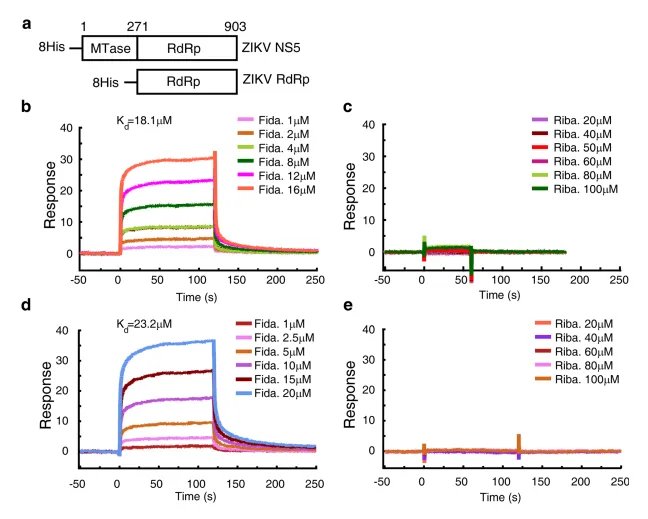 a. 不同研究蛋白对象的克隆构建示意图;b-e. fidaxomicin/蛋白 NS5、ribavirin/蛋白 NS5、fidaxomicin/蛋白 RdRp 和 ribavirin/蛋白 RdRp 的动力学/亲和力表征结果