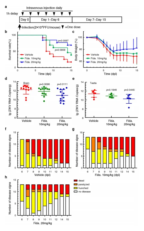 a. 体内抗病毒效果实验原理图; b. fidaxomicin 治疗时,小鼠生存率图谱; c. fidaxomicin 治疗时,小鼠体重变化图谱; d. 小鼠脑部的病毒滴度; e. 小鼠睾丸部位病毒滴度; f-h. 神经系统的症状观察