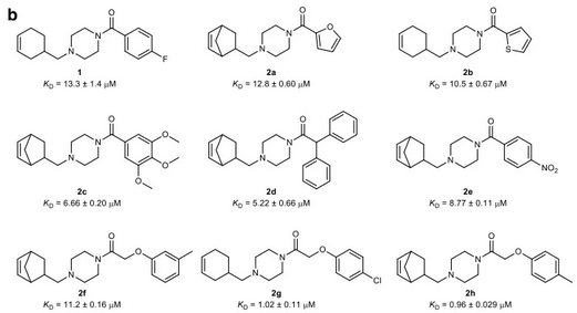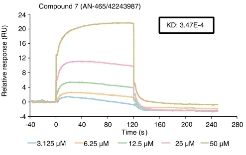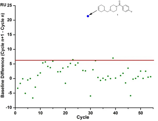 首先,研究先从27,000个小分子化合物中首先筛选出93种小分子,二次筛选就利用了我们的药物筛选利器——Biacore 8K,使用CM5芯片固定GPSM1蛋白,每种化合物以50 μmol/L流过芯片表面,最终筛选出10种有潜力的小分子化合物,再通过精准定量实验,确定了亲和力为3.47×10-4 M的化合物7:AN-465/42243987,可以作为T2D的候选药物。