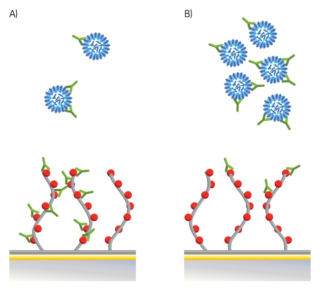 图1:Biacore流感病毒定量检测原理,A与B图分别表示病毒的浓度高低不同情况